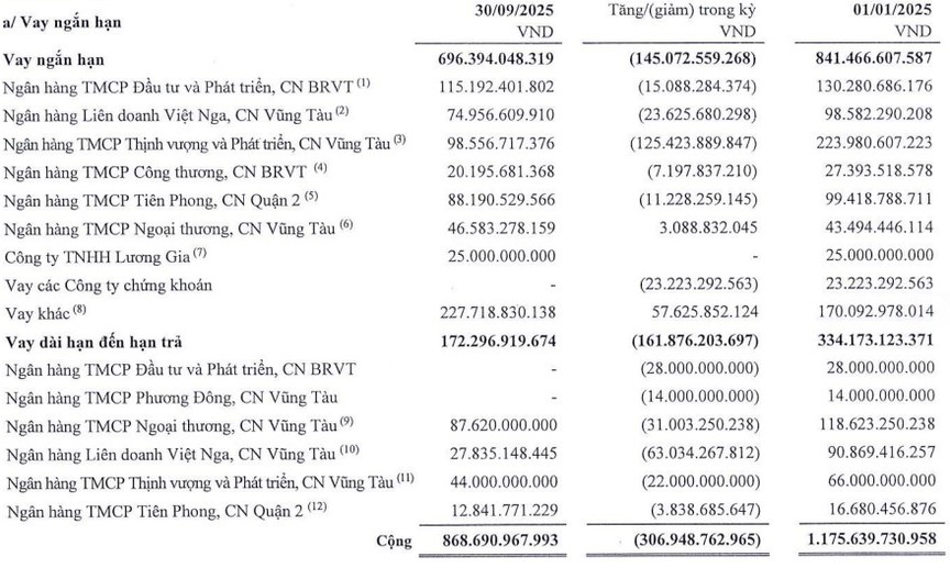 Cụ thể, công ty đang có khoảng 868 tỷ đồng vay ngắn hạn, giảm 26% so với đầu năm bao gồm: các khoản vay mới từ cuối năm 2024 – đầu năm 2025 với kỳ hạn từ 6 – 12 tháng (696 tỷ đồng); và các khoản vay dài hạn từ 5 – 10 năm đến hạn trả (172 tỷ đồng).