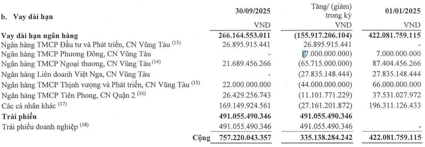 Đồng thời, công ty cũng ghi nhận 757 tỷ đồng vay dài hạn (tăng 79% so với đầu năm), bao gồm các khoản vay ngân hàng có kỳ hạn từ 3 – 6 năm (266 tỷ đồng) và phần gốc, lãi trái phiếu doanh nghiệp đã phát hành, đáo hạn vào quý III/2028 (491 tỷ đồng)./.