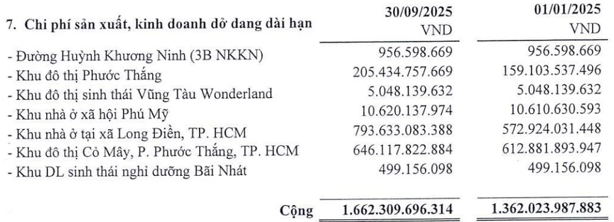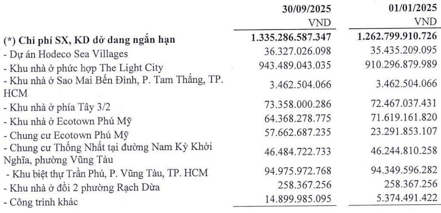 Tại ngày 30/9/2025, Hodeco cũng ghi nhận thêm 1.662 tỷ đồng chi phí sản xuất, kinh doanh dở dang dài hạn, tăng 22% so với đầu năm. Đây là chi phí ghi nhận tại các dự án như Khu đô thị Phước Thắng (205 tỷ đồng), Khu nhà ở tại xã Long Điền, TP.HCM (793 tỷ đồng), Khu đô thị Cỏ Mây (646 tỷ đồng), Khu nhà ở xã hội Phú Mỹ (10 tỷ đồng)...